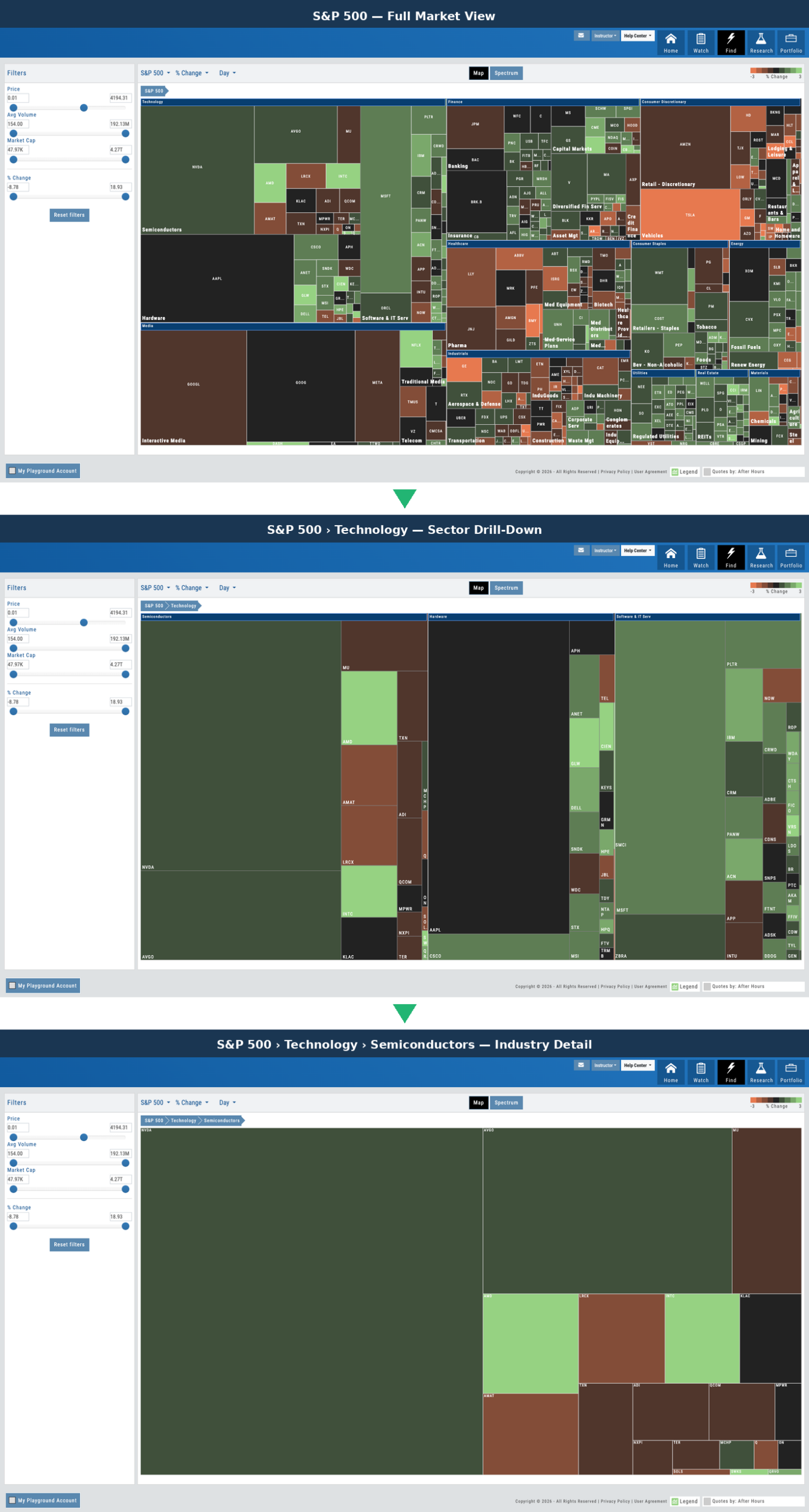 Progression from full market heatmap to sector view to individual stocks