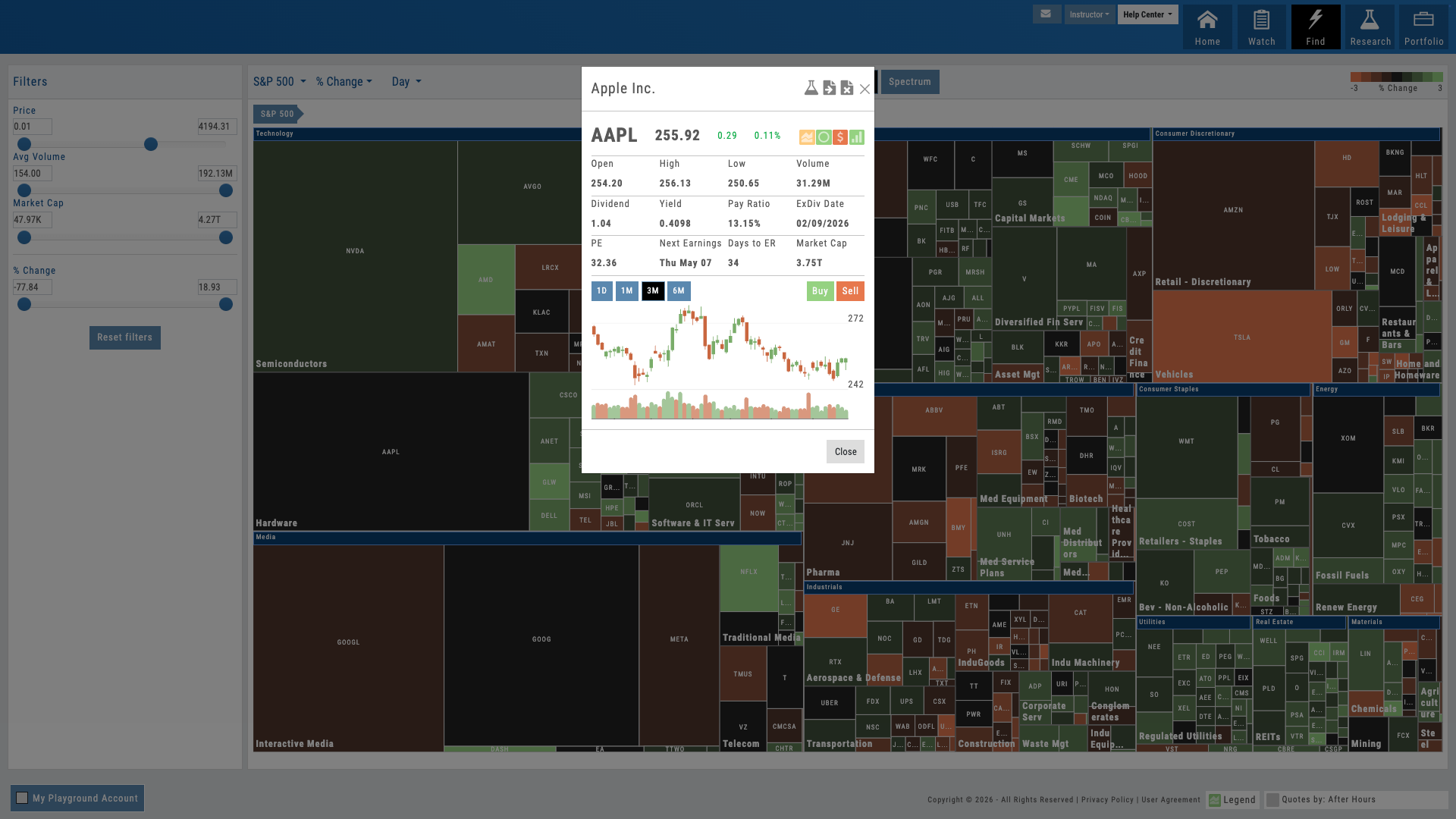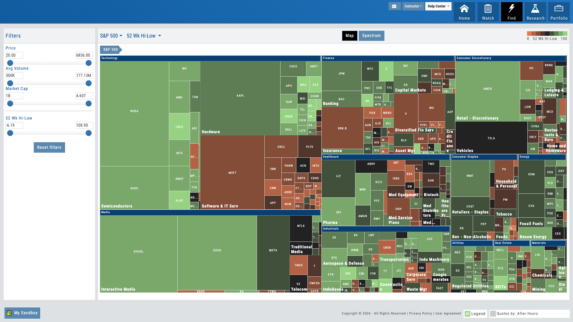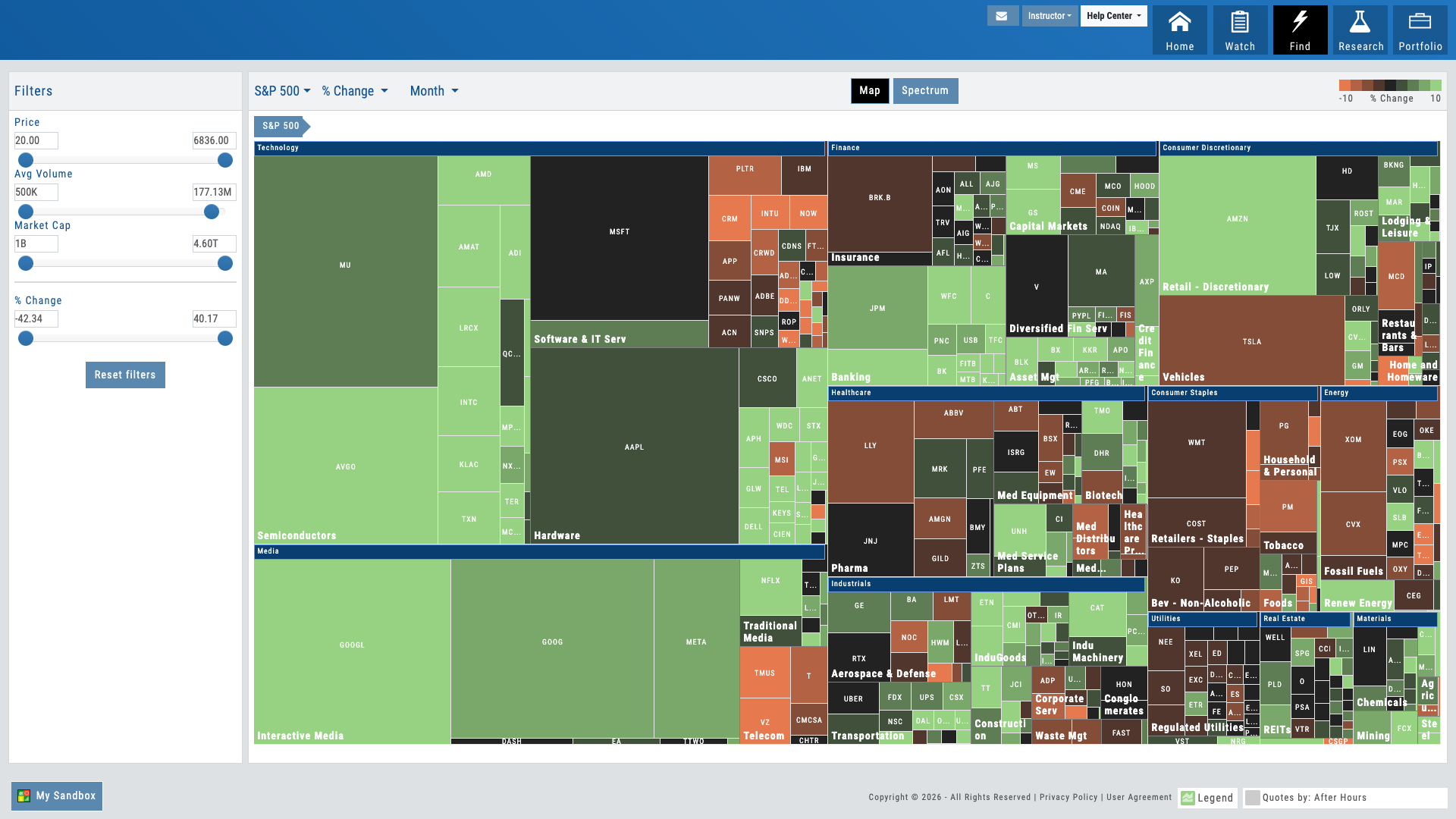 S&P sectors color-coded by performance. Drill from index to sector to industry to stock in one click. Size represents market cap. Multiple timeframes: 1D, 1W, 1M, 3M, YTD, 1Y. The perfect starting point for market discussion — open the heatmap and teach from what’s happening now.