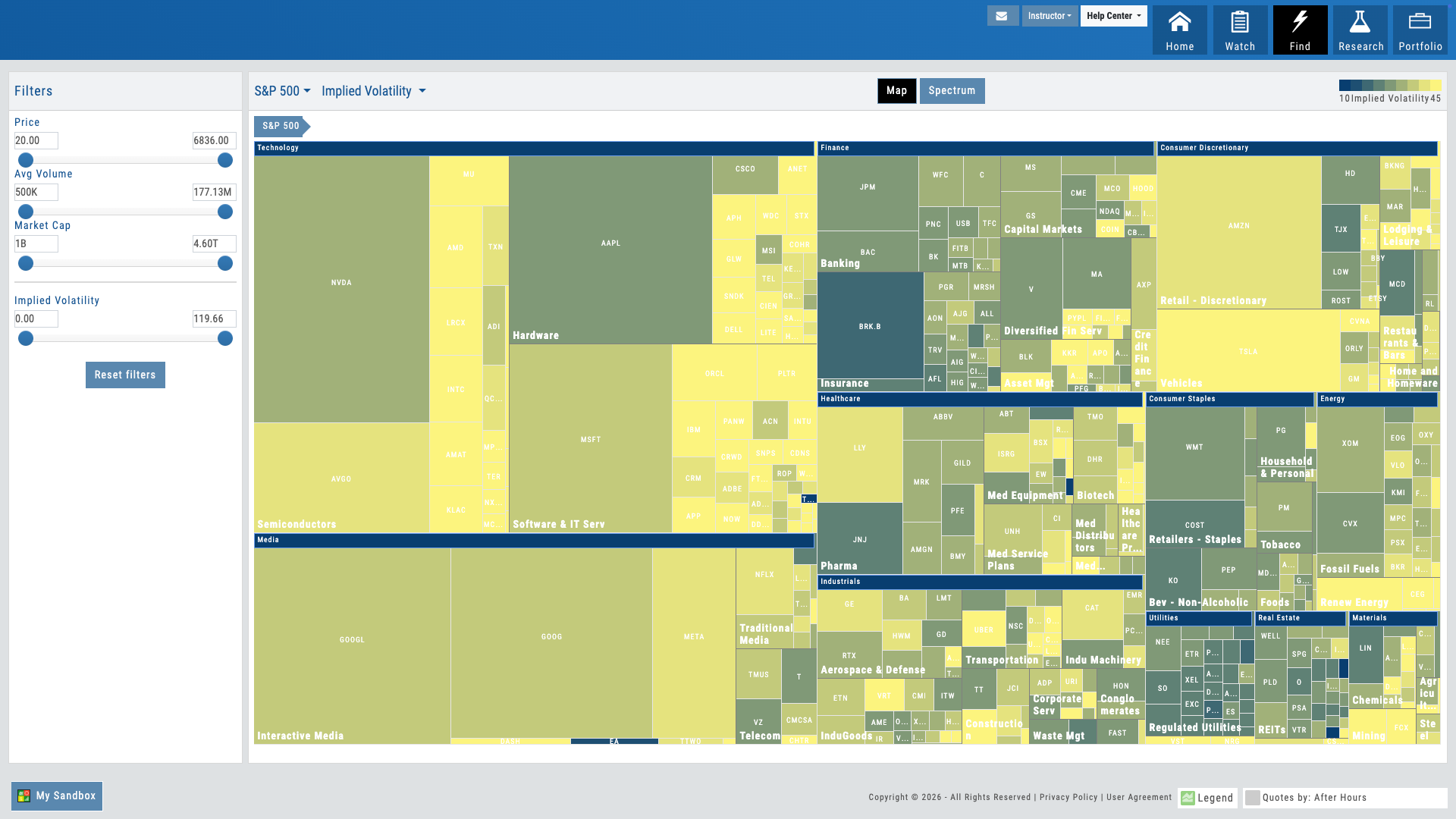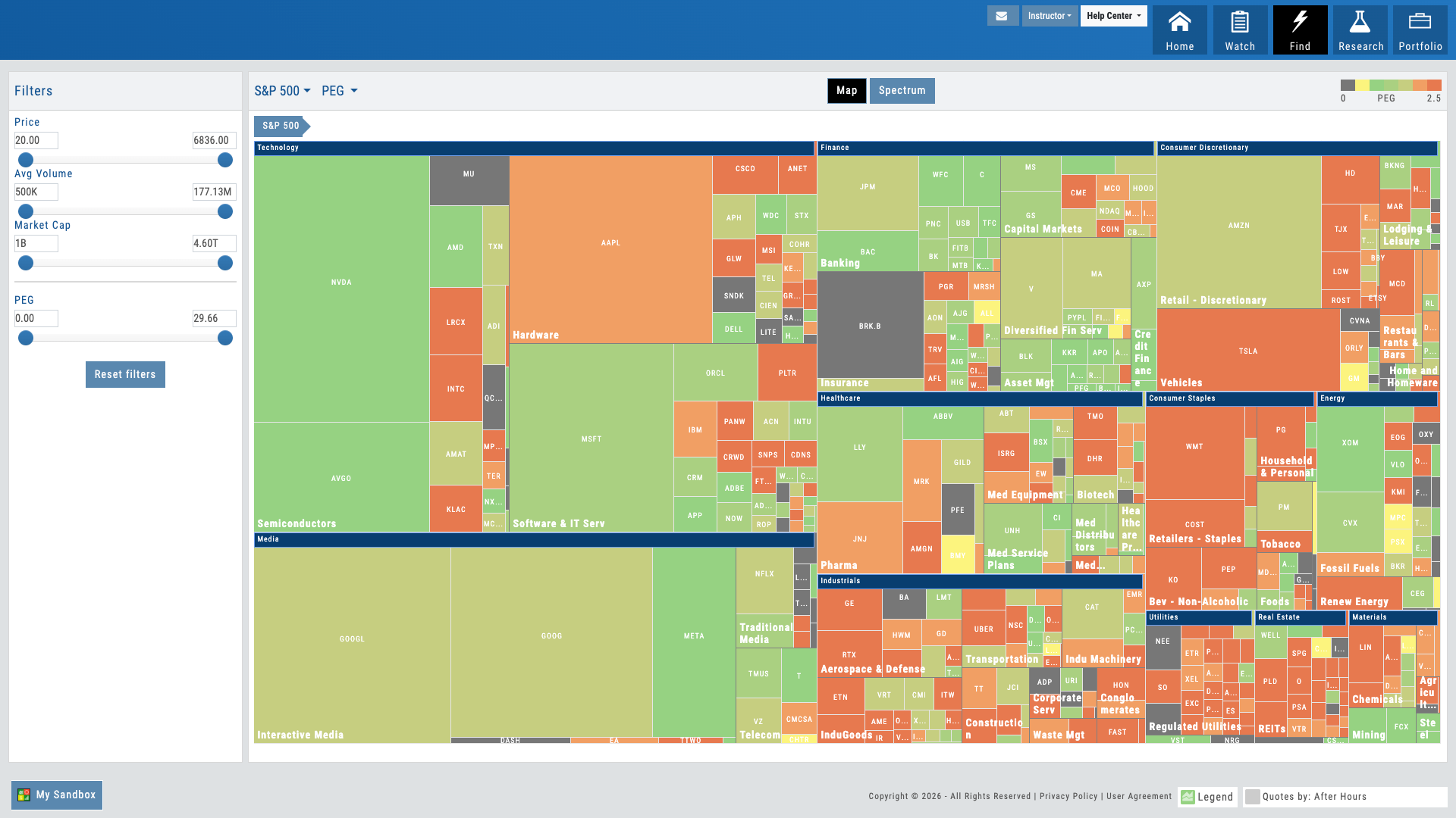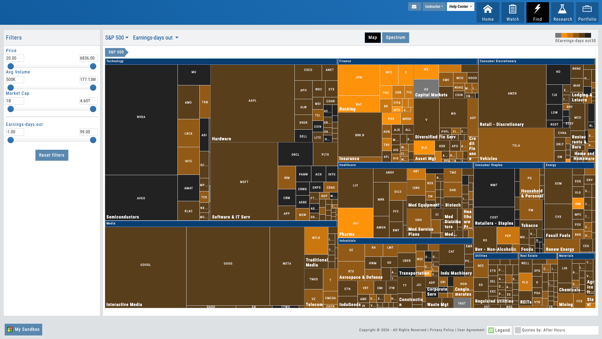 S&P sectors color-coded by performance. Drill from index to sector to industry to stock in one click. Size represents market cap. Multiple timeframes: 1D, 1W, 1M, 3M, YTD, 1Y. The perfect starting point for market discussion — open the heatmap and teach from what’s happening now.