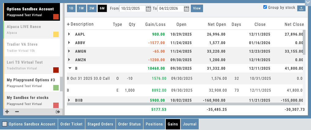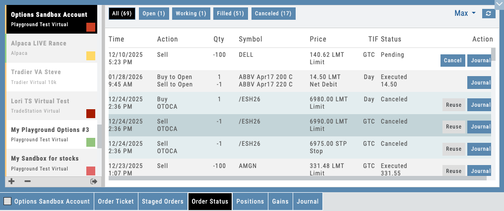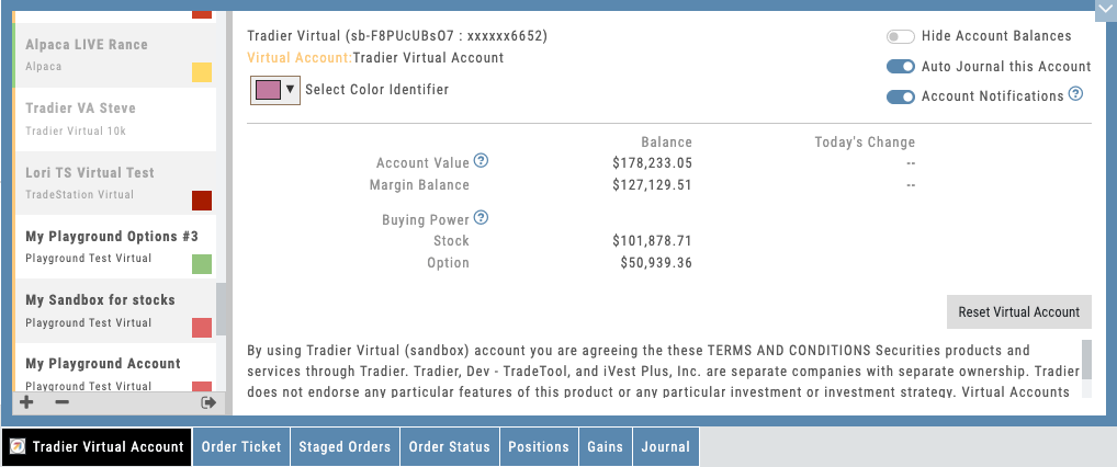 Beyond live accounts, the platform includes a built-in virtual account that’s one of the best in the industry. It handles realistic fills, exercise, assignment, and cash-settled index options — so students learn with the same mechanics they’ll face with real money. This is not simplified paper trading that breaks down on complex strategies.
