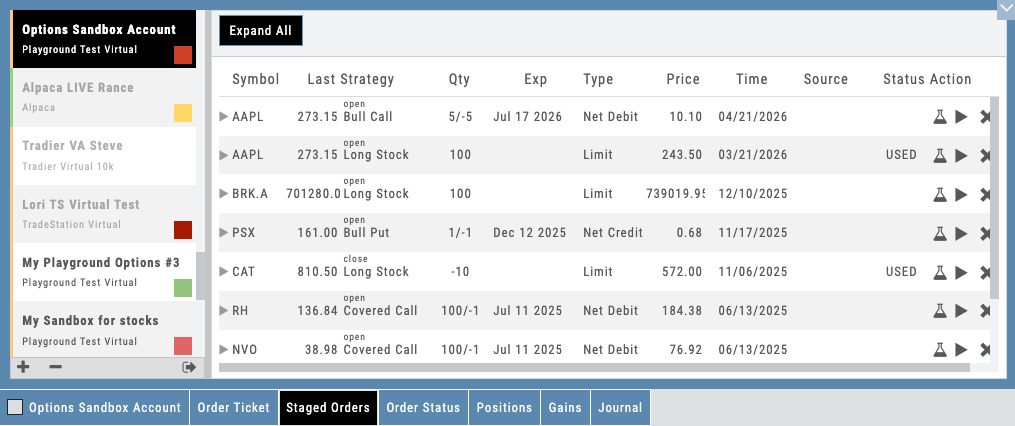 Users can also stage trades for later execution — saving positions from scans, templates, or the chain without submitting to the broker. Staged trades persist across sessions and can be reviewed, modified, and executed when the setup confirms. It’s a workflow discipline tool that teaches patience and planning.