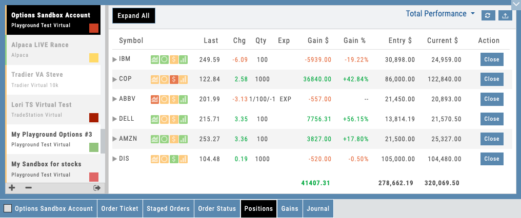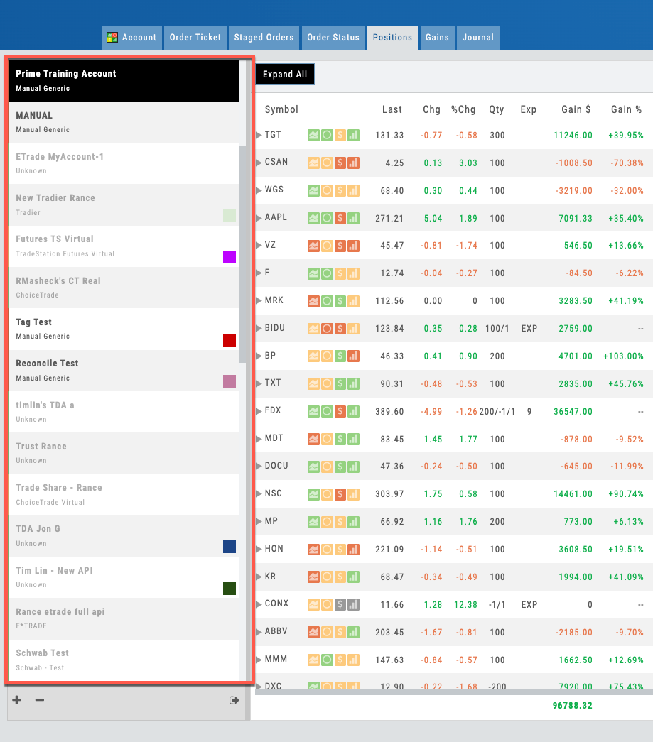 Most traders juggle multiple brokers: one for stocks, another for options, a third for margin accounts. The Portfolio module aggregates all of them. Connect any account and see a consolidated view: total account balances, combined buying power, available margin across all accounts, and every position in one list.