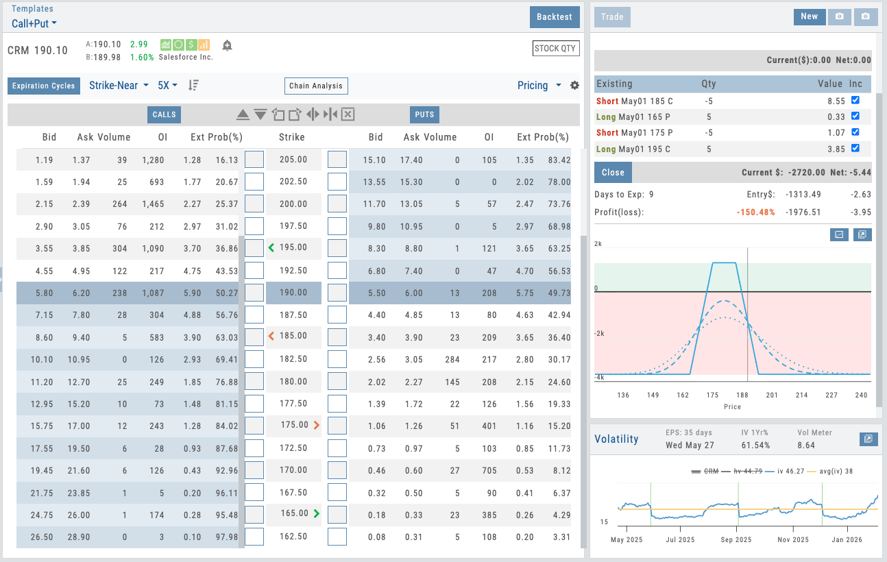 Place, modify, cancel, roll, close, assign, monitor — all inside the platform. The brokerage integration runs deep, not just at the trade ticket.