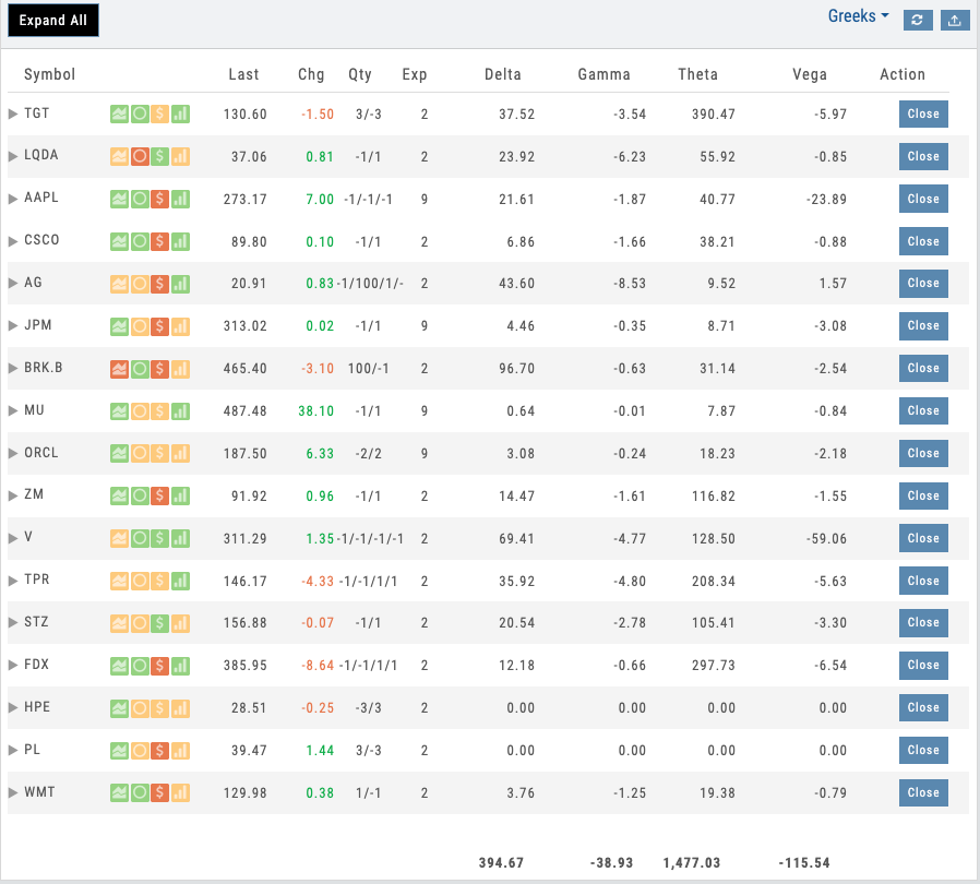 Portfolio Greeks panel showing aggregated Delta, Gamma, Theta, Vega