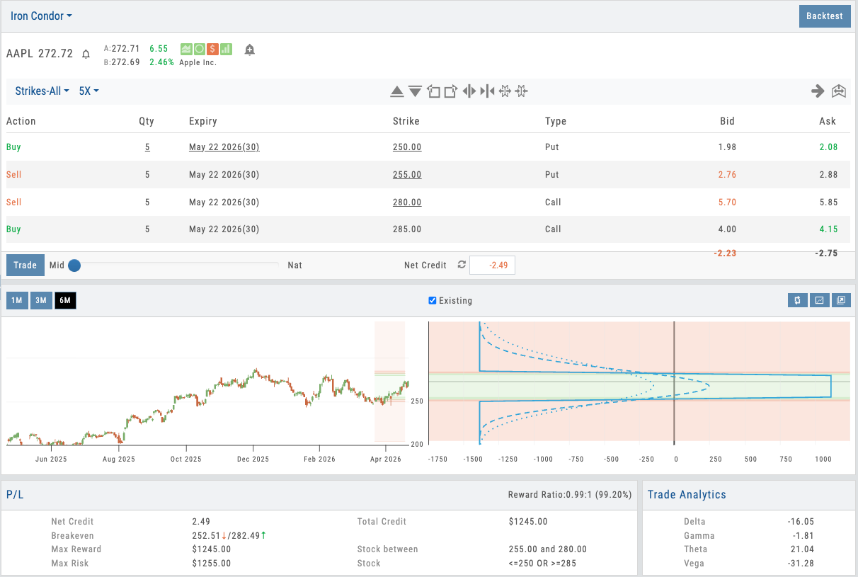 Positions live on the options page — roll, adjust, or add legs without switching views