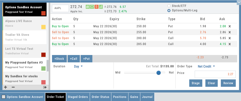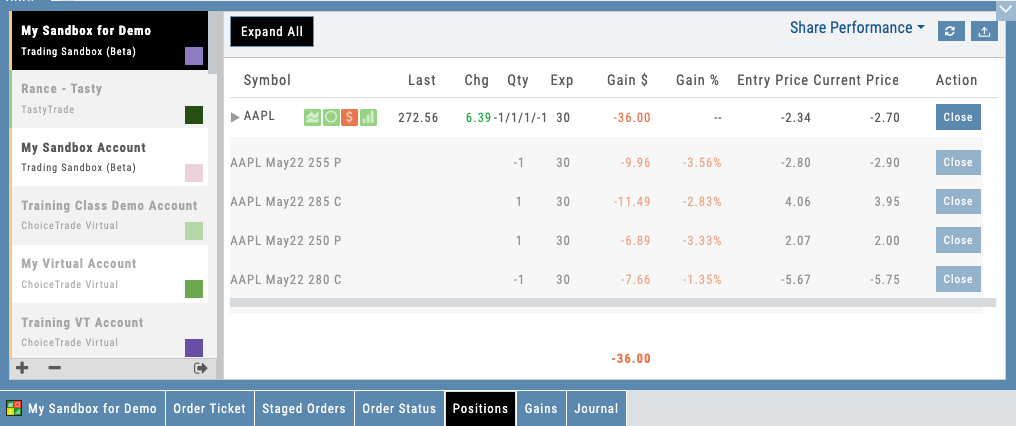 Click on a multi-leg position and see every leg broken out: strike, expiration, quantity, cost basis, current mark, and P&L. The portfolio knows it’s a single trade with two legs, not two unrelated positions. For educators, this is critical: it lets students understand that they built a coherent strategy, not accidentally opened two side bets.