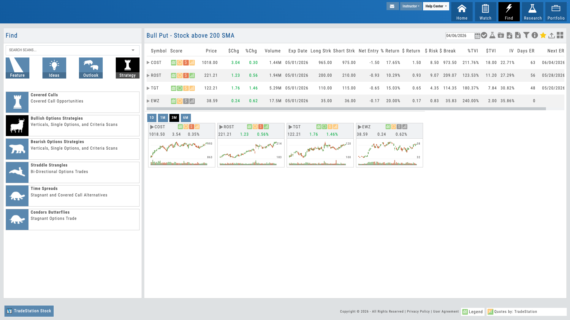 • Options strategy scans — Bull Call, Iron Condor, Covered Call, Straddle, and more