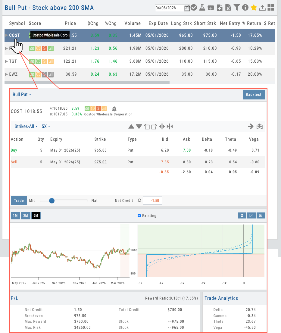 • Click a scan result to open in Options Analytics