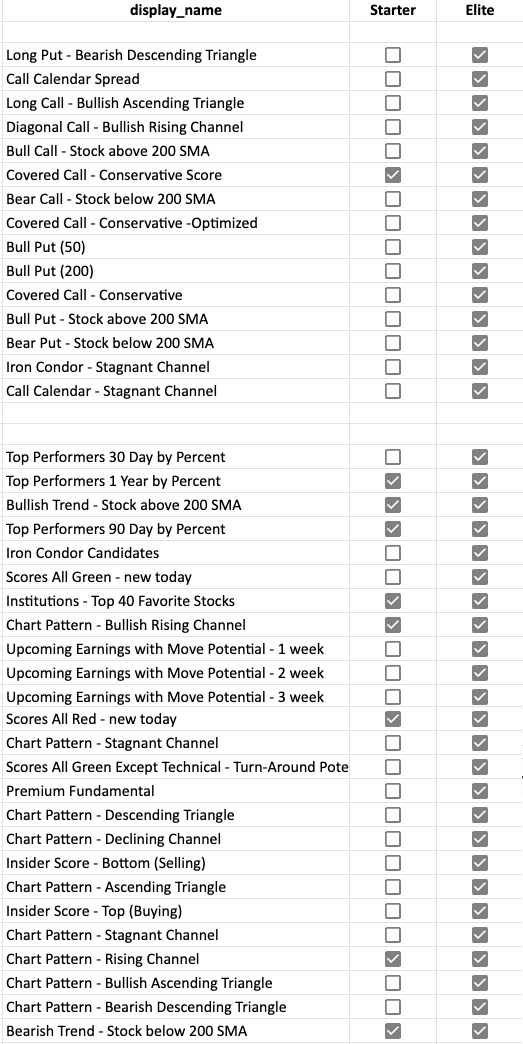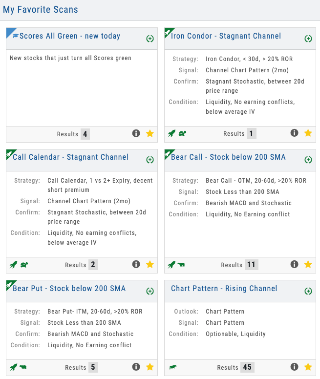 Options strategy scans like Bull Call, Iron Condor, and Covered Call — plus directional scans for bullish trending, bearish trending, and stagnant markets. Each shows qualifying trades in real time.
